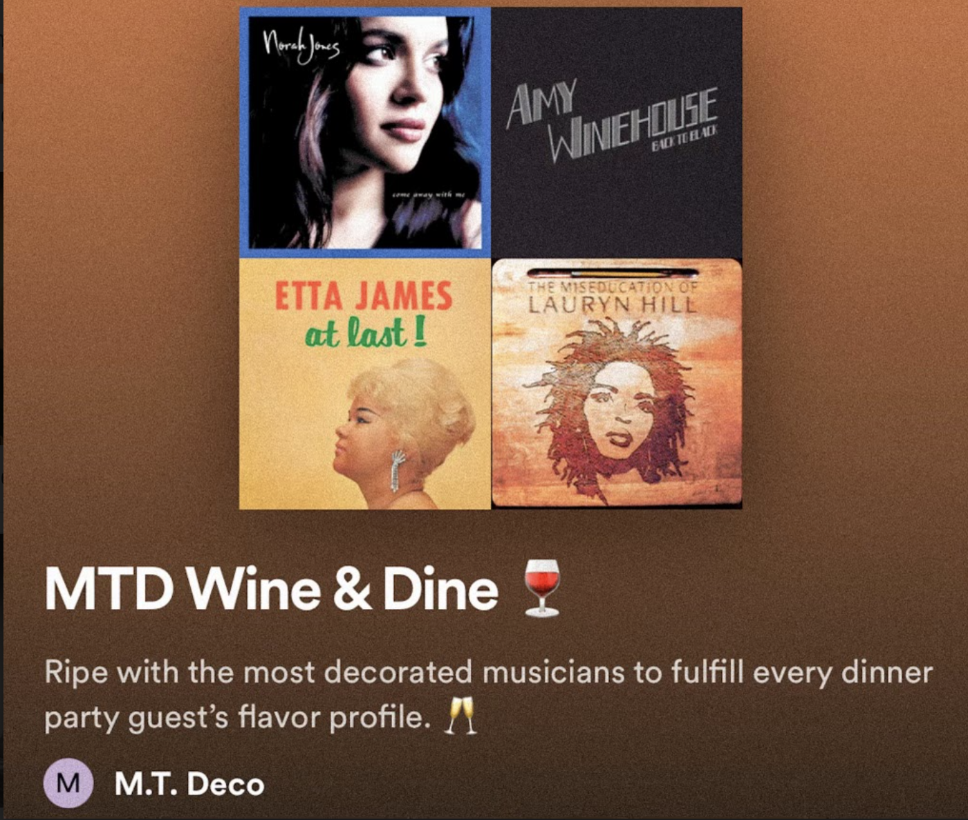 Prepare to be wined and dined – M.T. Deco style! I’m not sure if it’s because I’m from the Midwest and the phrase “hostess with the mostest” was used very often, but I LOVE having people over. The joy of feeding people and making sure everyone has enough to eat and drink and then see them smiling is something I’ve always enjoyed. Needless to say, this *wine & dine* playlist was a treat to create! It’s a 3-hour dinner party playlist, ripe with some of the most decorated musicians to fulfill almost every flavor profile. No doubt Frank Sinatra will shmooze even the pickiest of party-goers, while Norah Jones lulls them into sweet serenity. You might recognize a few hits by some newer artists with killer female vocals *ahem Joss Stone* and obviously you can’t have a dinner party playlist without a side of Michael Bublé.